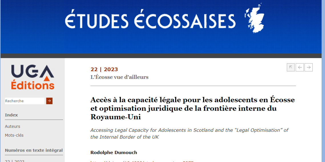 Cet article intitulé « Accès à la capacité légale pour les adolescents en Écosse et optimisation juridique de la frontière interne du Royaume‑Uni » est sorti en avril 2023. Pour des raisons de droit, son contenu étant exclusivement à la revue Études Écossaises de l’Université de Grenoble-Alpes, il ne peut être reproduit ici. Les recherches de l’association…