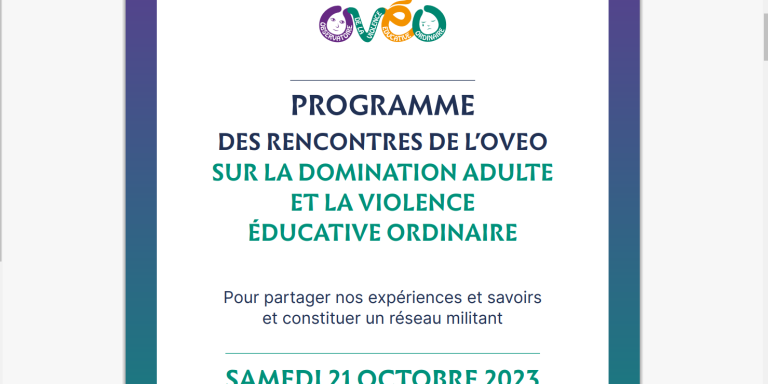 L’association a participé aux rencontres de l’Observatoire de la Violence Éducative Ordinaire du 21 octobre 2023. Cette association, initialement, ne travaillait que sur la question des châtiments corporels ; elle a récemment élargi ses préoccupations à toutes les formes de domination adulte. Notre association d’y retrouve donc désormais. Notre communication portait sur « Le statut juridique…